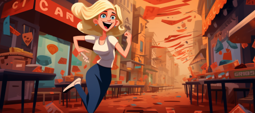 carton illustration, pixar style movie coco, a busy, very stressed blonde woman running a pizzeria --ar 18:8