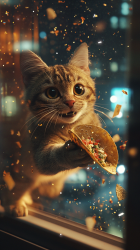 a 3D animated tabby cat teleporting back onto a windowsill, trail of confetti and sparkles, half-eaten taco in mouth, mischievous expression, city night scene visible through window --ar 9:16