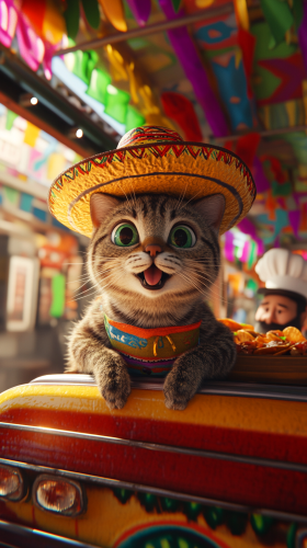 a 3D animated tabby cat wearing a tiny sombrero, perched atop a surprised chef's head inside a taco truck, colorful Mexican decorations in the background --ar 9:16