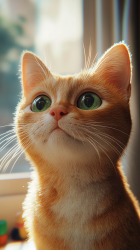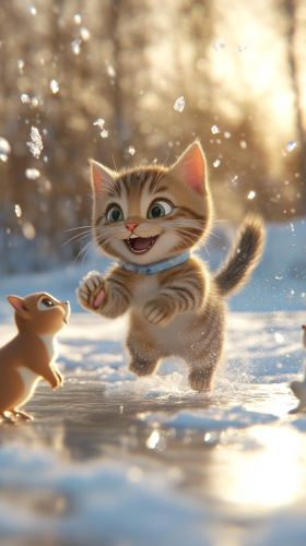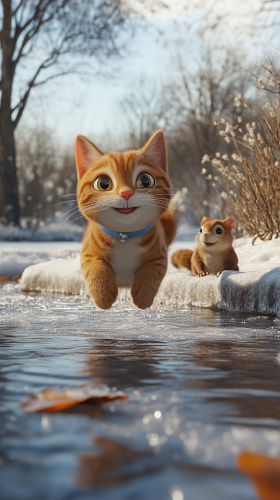 Whiskers, the playful tabby cat with light brown stripes and a tiny blue collar, performing a funny spin and sliding on the ice, laughter echoed by the squirrels, in a whimsical winter landscape, Pixar-style 3D animation, bright lighting, medium shot focusing on the spin --ar 9:16