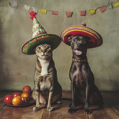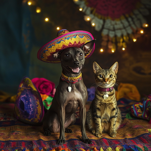 A happy strong xoloitzcuintle. And a happy tabby cat. Sit on floor. Wearing mexican hats. Celebrating mexican independence day. Green, white and red color palette. At mexican backyard. Three flashlight sources. Natural light. Photo direction. Magazine photo. Art direction