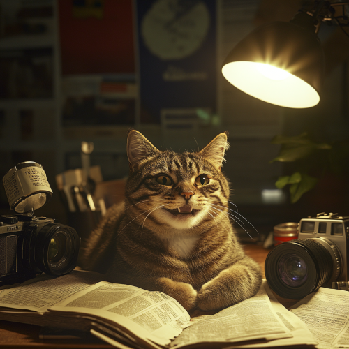 A happy smiling tabby cat. Laying down on a journalist desktop. There is a bunch of newspaper, a camera, a microphone, and journal tools around. Three flashlight sources. Natural light. Photo direction. Art direction.
