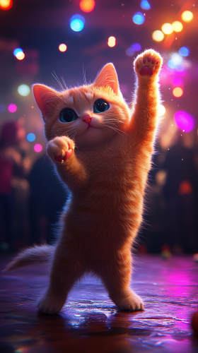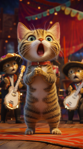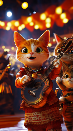 a 3D animated tabby cat playing a tiny guitar, surrounded by cheering mariachi cats, confetti falling, dynamic stage lighting, lively expressions --ar 9:16