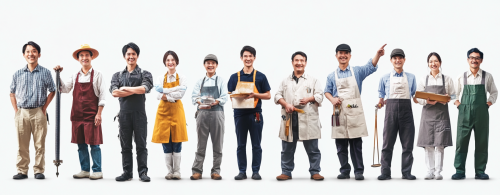 A group of happy representatives of Taiwanese professionals, including plumbers, computer engineers, painters, bakers, and architects, white background