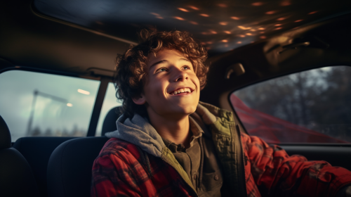 happy older teenage boy photographed inside backseat suv, joyful, laughing, warm lighting, photoshoot, commerical grading, 8k --ar 16:9
