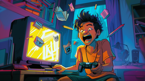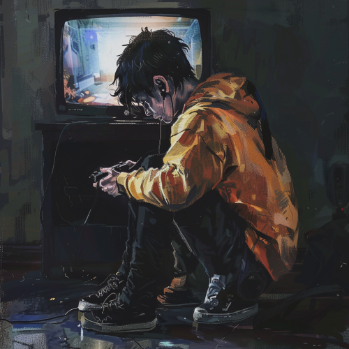 photo of a teenager playing computer, use colors Soft Ivory and Deep Crimson and Vibrant Tangerine and Midnight Blue, photorealistic fantasies, sigma 85mm f/1.4 dg hsm art, monumental, expressive --ar 16:9 --v 5.0
