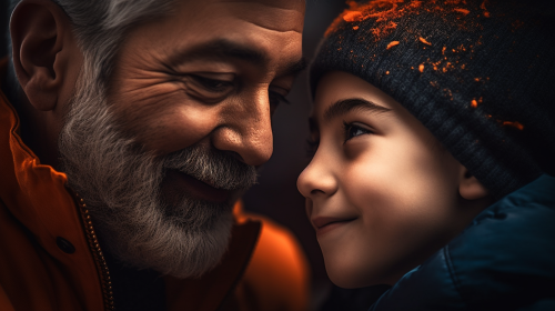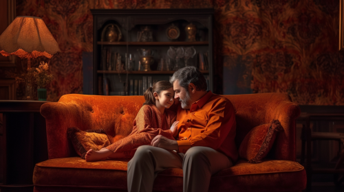 photo of a happy dad and 13 year old child bonding together, use colors Soft Ivory and Deep Crimson and Vibrant Tangerine and Midnight Blue, photorealistic fantasies, sigma 85mm f/1.4 dg hsm art, monumental, expressive --ar 16:9 --v 5.0