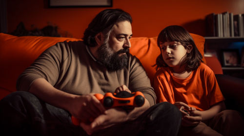 photo of a happy dad and 13 year old child sitting in sofa and playing videogames, use colors Soft Ivory and Deep Crimson and Vibrant Tangerine and Midnight Blue, photorealistic fantasies, sigma 85mm f/1.4 dg hsm art, monumental, expressive --ar 16:9 --v 5.0