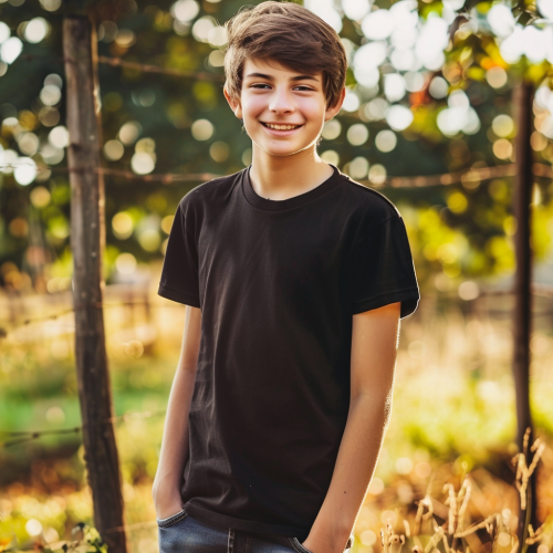 Plain black t-shirt mock-up, smiling and happy teenager 17 year old youth wearing a totally plain black t-shirt, standing front on, farmyard background, lots of natural sunlight, photo realistic