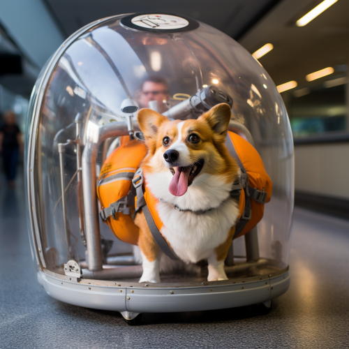 corgi getting into a small corgi shaped teleportation machine with the destination LAX with a helmet 8k resolution