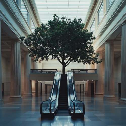 Art museum's lobby, In the photo composition, a tree is located in the center, and an escalator is located in the front right of it in the form of going up from left to right based on the photo.