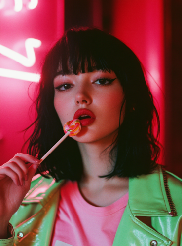 Photograph of a woman with black hair and bangs, wearing a pink t-shirt and green fluo high visivable leather jacket, licking a lollipop candy stick that take with haer fingers in the style of 80's aesthetic, she is facing forward towards the camera, she blinks to the camera with a provocatory mood, against a backdrop of pink lighting in a dark room with a neon light, shot on Kodak Portra film. --ar 47:64