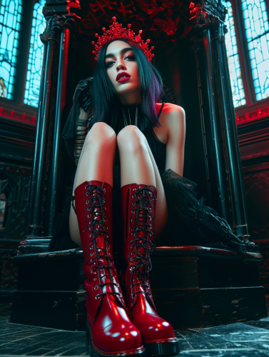 Dua Lipa as a goth, layered hair, red dr martens boots, low-angle, sitting inside a black palace, red ruby crown, taking off her boots --v 6.0 --ar 3:4