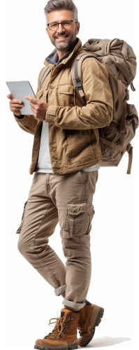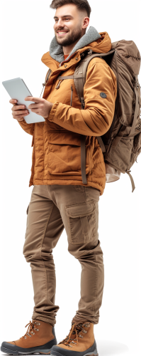 dynamic happy handsome man with tablet, tablet, stock photography, ultra white background, studio quality, professional photograpy, full body, zoom out, side position, backpack, trekking outfit --stylize 250 --v 6.0 --style raw --ar 2:5