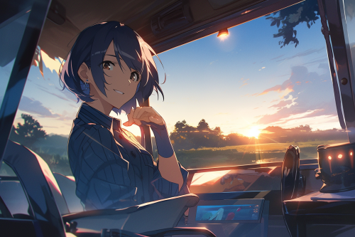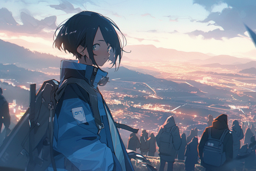 short hair, blue hair, black eyes, jacket, standing, High Spirits/Motivated, Fair skin, outdoors, landscape, looking at viewer, thick outline, black outline, 30years old, --niji 5 --style scenic --ar 3:2 --s 1000