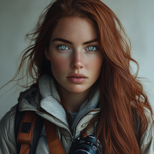 a photorealistic image of a woman with long chestnut-brown hair, icy blue eyes, pale skin with light freckles and full lips. She’s wearing a hiking jacket and a digital canon camera is attached to a strap that dangles from around her neck.