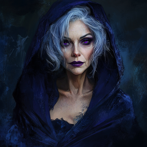 digital painting, older woman, messy shoulder length blue hair, pale skin, purple eyes, dark purple lipstick, wearing a dark blue hood and cloak over a strapless black dres