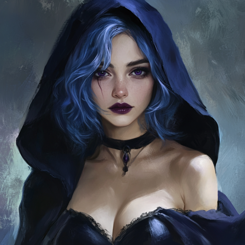 digital painting, woman in her forties, messy shoulder length blue hair, pale skin, purple eyes, dark purple lipstick, wearing a dark blue hood and cloak over a strapless black dress