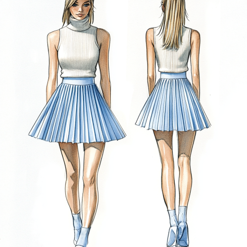 a fashion illustration sketch of a woman wearing sleeveless light cream turtle neck and a short light blue pleated skirt for golf. Make the model wearing a blue pleated skirt.
