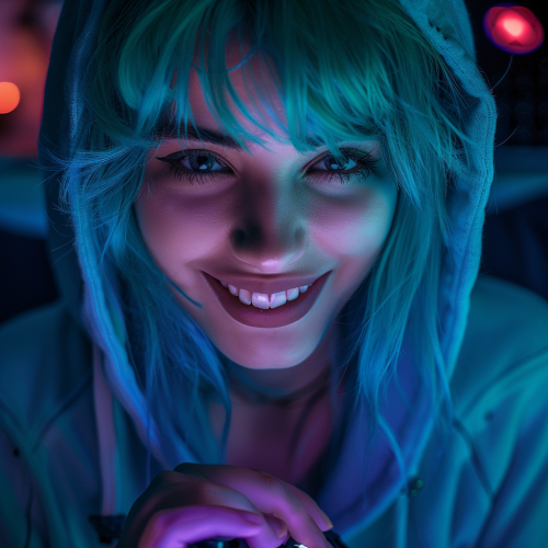 European blue hair beauty female model. 24 years old, Xbox gamepad on her hand, Thick eyebrow, large hoodie, neon colors, minimalist style, beautiful image, smiling, happy, comfortable state of mind, scene image, simple, bokeh effect, portrait fixed focal length lens shot, photographic texture, 8k HD --v 6.0