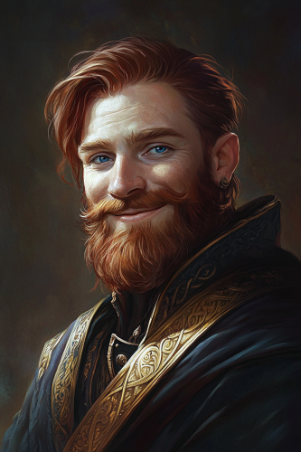 a dwarven male, auburn hair but short on the sides, happy blue eyes, stocky build wearing dark colored robes, by artgerm, d&d character, highly detailed portrait, digital painting, artstation, concept art, cross hatched shading, --ar 2:3 --v 6.1
