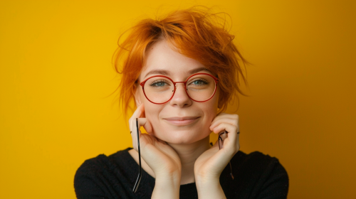 portrait of a smiling simple woman with orange hair 30 yo in black with glasses on a bright yellow background studio shooting, she holds red-rimmed glasses with two hands a big copy space --ar 16:9 --v 6.0 --style raw