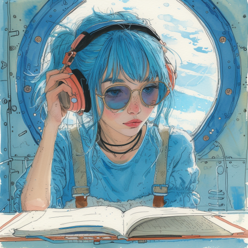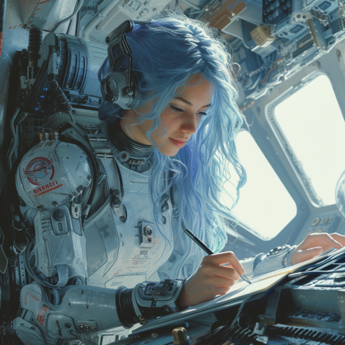 happy woman writer with blue hair, in a space ship, she just finish writing her novel, blue aquarel, shades of blue on light blue background, --v 6.0 --s 250