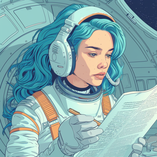 happy woman writer with blue hair, in a space ship, she just finish writing her novel, illustration, shades of blue on light blue background, --v 6.0 --s 250