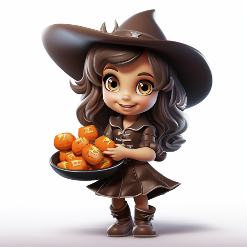 Cute cartoon happy Halloween witch holding a bowl of chocolate candy for trick a treaters, on white background for t shirts merchandise design, high resolution, 3 D --v 5.2 --ar 1:1