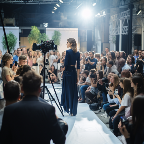 generate a picture behind the sciene picture of a cameraman filming the the stylist of a fashion catwalk event