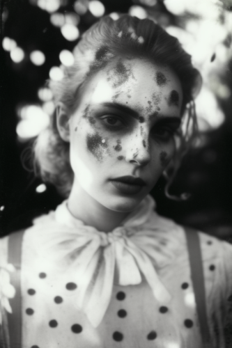 A black and white photo with scratches and peeling film emulsion, a pierrot from head to toe, in the woods, in the style of Francesca Woodman, film photography, fashion photography --ar 2:3 --v 4