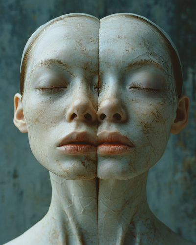 conjoined face by conjoined twins, photo in style of Harper bazaar, 35mm photo of a woman with a strange looking mouth, in the style of patricia piccinini, miwa komatsu, photo-realistic techniques, disfigured forms, webcam, forced perspective, 1989 photo print ad --ar 4:5 --v 6.0 --s 250