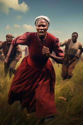 arial epic ultra realistic image of Harriet Tubman escaping from slavery, running through a feild. a group of men far behind her chasing her. use vivid colors and high definition. --ar 2:3 --v 5.2