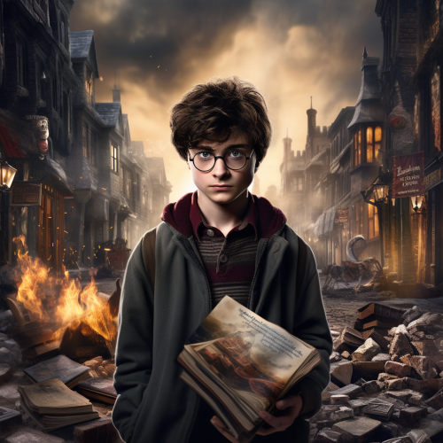 An epic scene with an old Harry Potter in a wand fight against in a wrecked hogwards. 8K views, high resolutions, natural lighting, natural looking face, ultra realistic, phase one --stylize 1000 --v 6.0