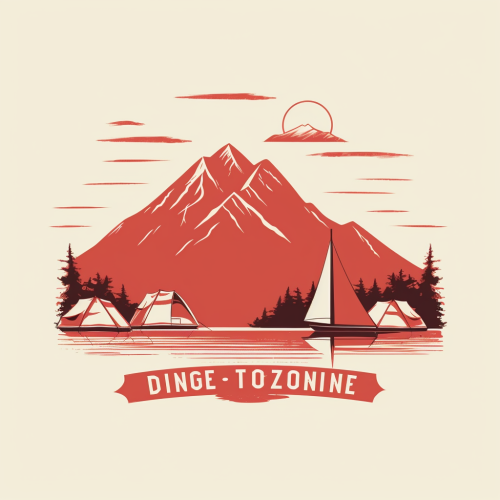 Simple, monochrome red logo for a lakeside campsite called "Camping de la Duzonne". In retro American style.