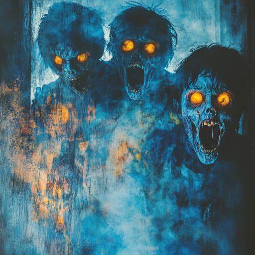 create a playful yet spooky neon greens drawn poster of dj turn tables with a playfully dead cartoon lizard on one of the disks. show the ghost of the lizard with dj headphones on floating above with musical notes all around.