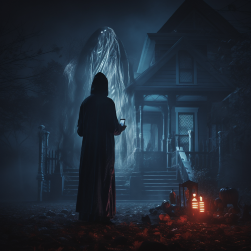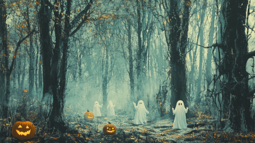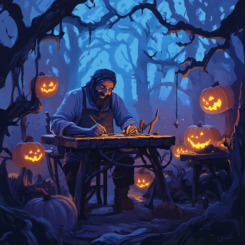 A ghostly woodworker crafting furniture from twisted branches in a haunted forest. The carpenter has a friendly smile, with a backdrop of glowing pumpkins and flickering lanterns