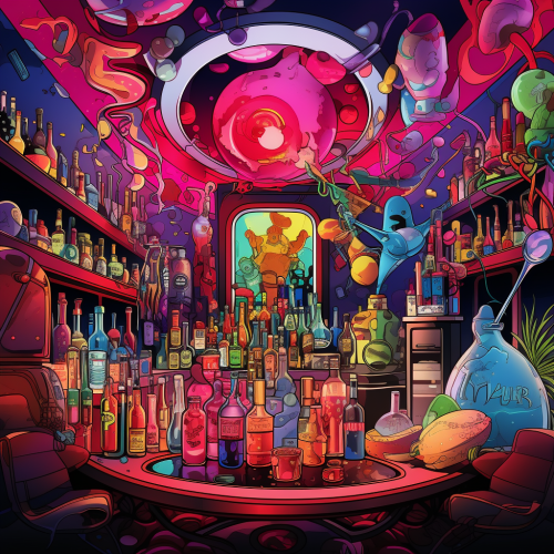 high end bottle service club, full club with dj, cartoon, vibrant colors