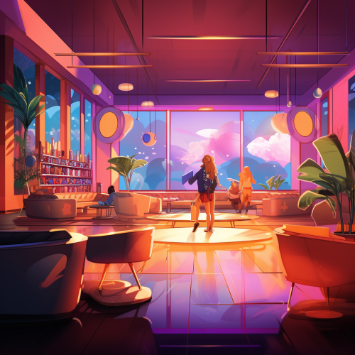 luxury club in cartoon with a dj in the far back, interior photo, vibrant colors