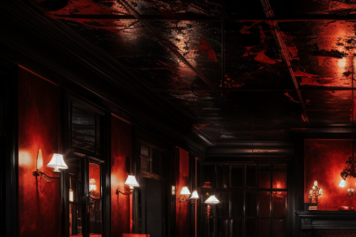 haunted historic hotel restaurant in New York at night, darkness, everything in black and red colors, dark and disturbing atmosphere --no stairs --ar 3:2