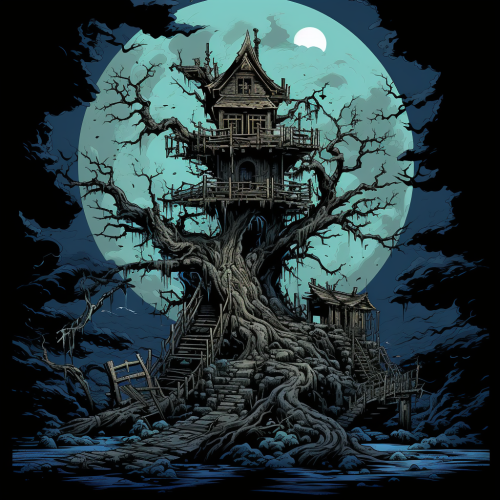 1980s seinen anime by Yoshiyuki Sadamoto, landscape, halloween, haunted house, ghosts, bats, jack-o-laterns, autumn, night, full moon, fallen leaves, spooky, macabre,