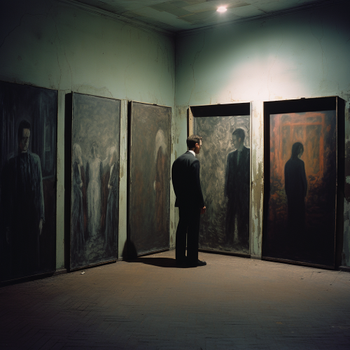 golden gate bridge, fogbound, acrylic on canvas with haunting mixed media collage, signs and symbols, surreal, gothic landscape --weird 150 --c 10 --ar 1:1