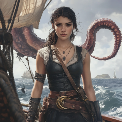Photorealistic image of the front view of a short Caucasian white woman with dark hair wearing clothing befitting a captain standing on the deck of her sailing ship. Behind her, a single giant tentacle rises above the ocean and is landing on the deck.