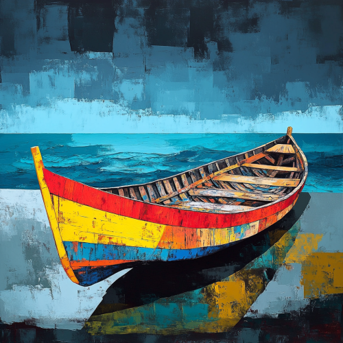 A vibrant, colorful Brazilian jangada boat in the foreground, with vivid red, yellow, and blue paint on its wooden structure, captured in a contemporary, realistic style. The boat is sharply detailed, contrasting against a somber, abstract background inspired by Nicolas de Staël. The background features broad, muted blocks of color in deep blues, grays, and dull greens, representing the sea and sky in a melancholic, textured style. The jangada's bright colors stand out against the sad, abstract seascape, creating a powerful visual contrast.