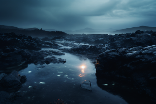 looking over an icelandic seascape, blue lagoon, obsidian glass rocks, beautiful, moody and dark --aspect 3:2