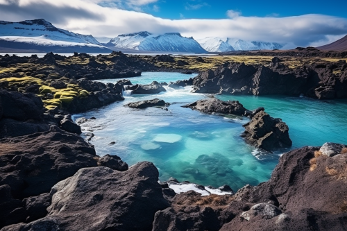 looking over an icelandic seascape, blue lagoon, black rocks, beautiful --aspect 3:2
