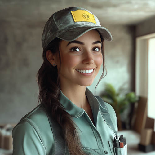 A Japanese woman dressed in a black hoodie, resembling an influencer, is cheerfully overseeing a move-out inspection indoors with a fresh, friendly smile. The image is so realistic it could be mistaken for real life, like a scene from a movie, perfect for promotional use.
