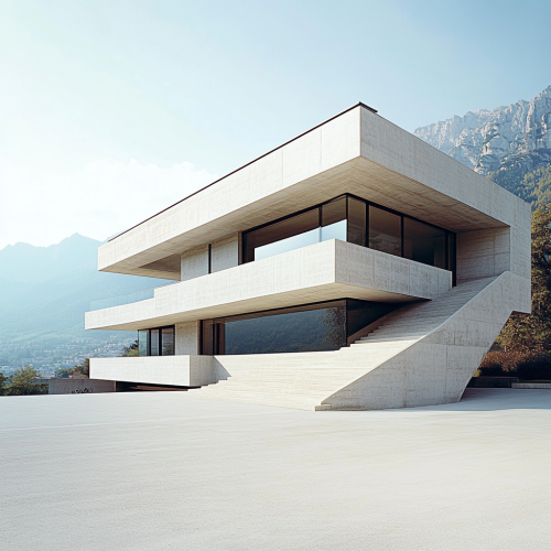 Elongated villa-style residential building in La Sarraz, Switzerland, with a simple and modern aesthetic. The structure has two levels: a ground floor and a first floor, referred to as ‘one level’ with one apartment per floor. An L-shaped balcony wraps around the corner on the eaves-side facade, providing expansive views. The building features a traditional two-sided sloped roof, emphasizing its villa-like volume and harmonious integration with the Swiss landscape. Designed with an elongated proportion (longer than it is wide), the facade is minimalistic with refined lines and muted tones, balancing elegance and functionality. Natural lighting enhances the realism of the scene, casting soft shadows that emphasize architectural details.