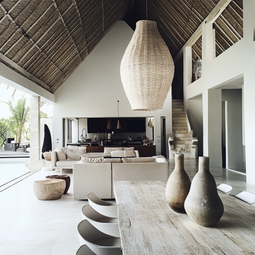 interior of a large bali villa large open plan living dining kitchen, thatc hced cathedral roof . eclectic modern soulful design. grand penadantg light . huge vases . neutral with pops of