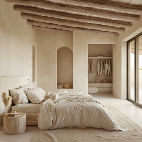 Photorealistic hd resolution image of a bedroom in a modern villa in Maiorca.Walls and floor are in cream resin. There is a high ceiling with bleached wooden beams. The bed is covered with linens sheets and blankets with a natural wood headboard. In the walls there is an opening from which you can see a modern walk in dressing.